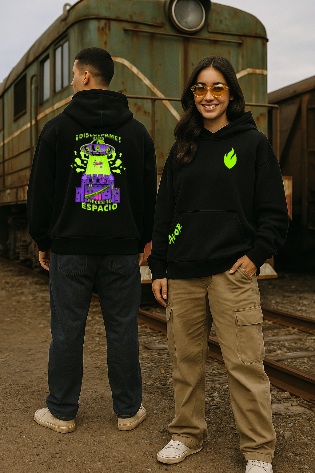 Una ilustración irreverente que convierte una propuesta de amor en una fuga cósmica. Humor, estilo y personalidad en una sola prenda.