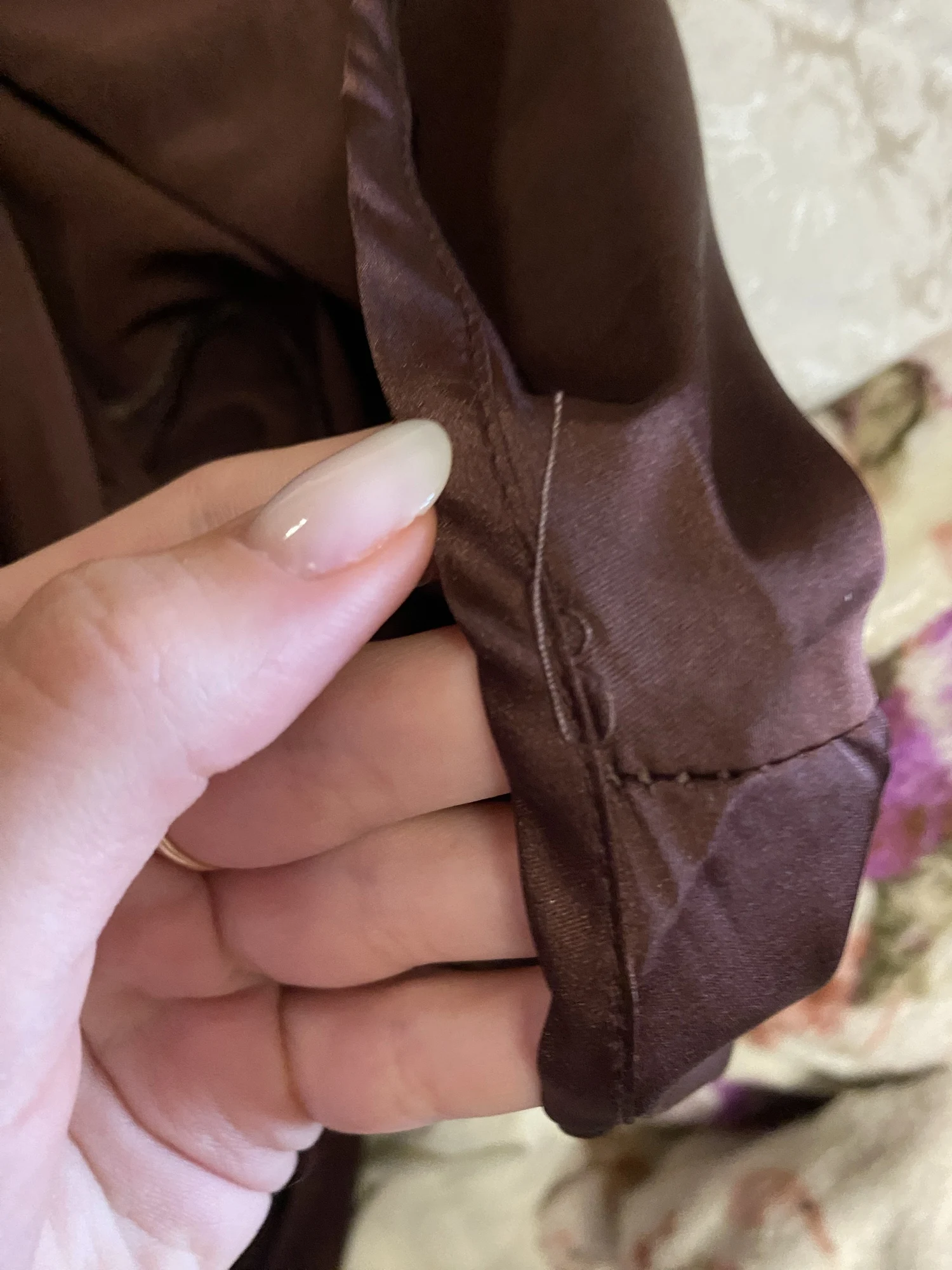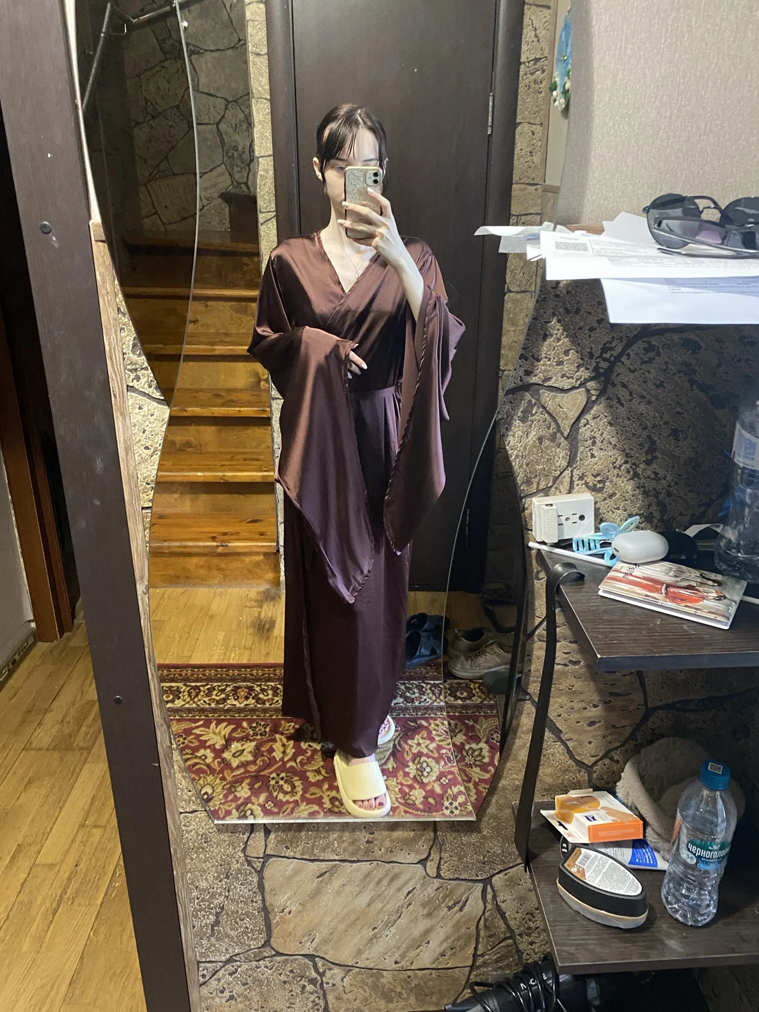 La bata es preciosa, la tela se siente agradable al tacto. La costura no es de muy alta calidad, hay hilos sueltos, la costura del cinturón se ha deshecho y hay un agujero. Los bordes no están cosidos uniformemente, hay muchas arrugas. Y el fabricante no anticipó que la tela es satinada y resbaladiza, y no cosió lazos internos, por lo que la bata en su forma de cintura atada se deshilacha rápidamente y revela todo lo posible, así que es mejor no usarla sobre el cuerpo desnudo a menos que tenga el objetivo de mostrar todo lo posible. Teniendo en cuenta que el bata y el costo de envío cuestan alrededor de 2400 rublos, es desagradable.